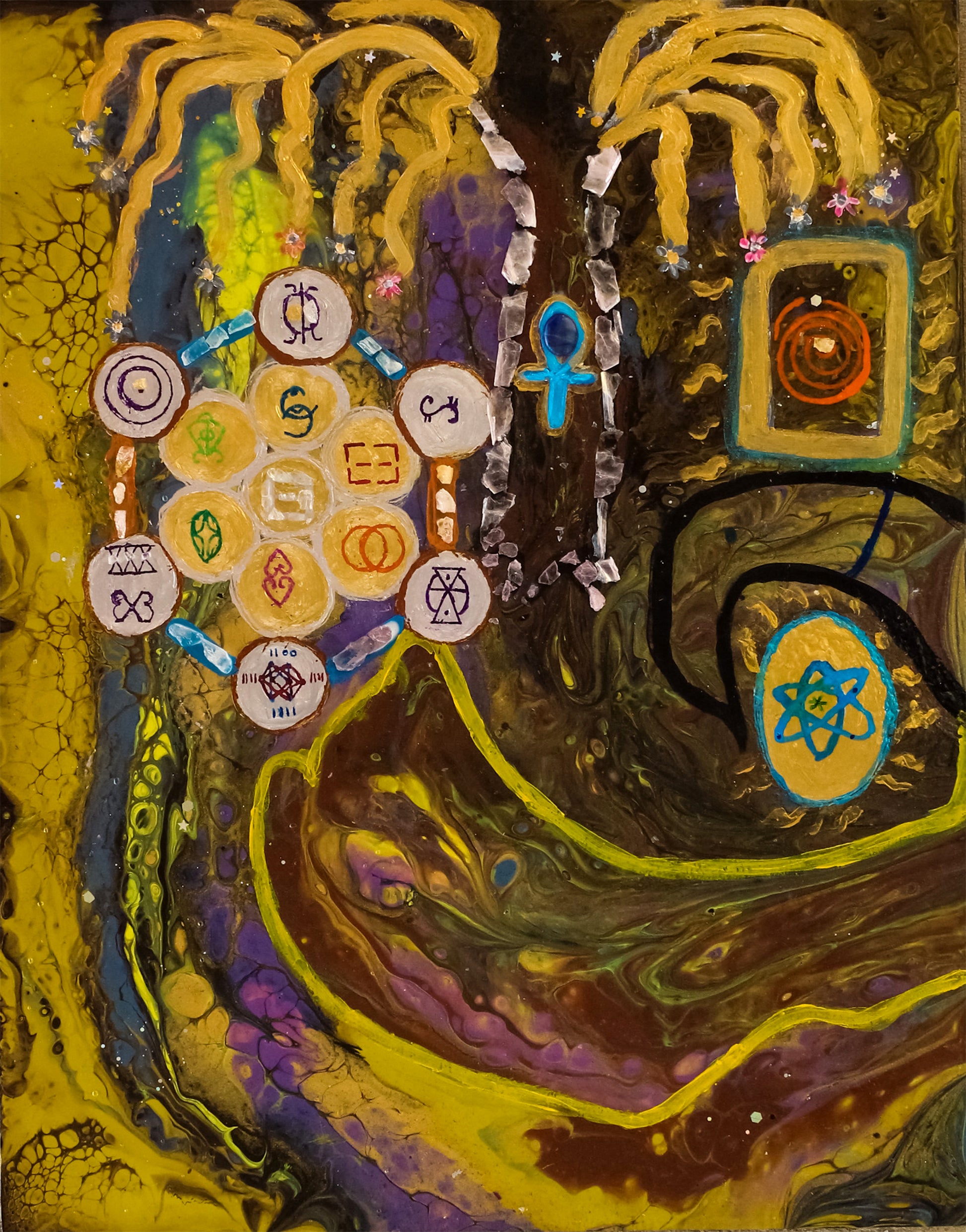 The spirit of Thoth is represented in figure with the bird head and astral body. In the center of his body below his head is a golden egg. This represents the egg of creation. This egg also contains the seed of life. This is seed is protected by the egg as it grows into new life. This new life represents our dreams and intentions. The spirit of Thoth is also protecting this egg. He is holding the egg within womb of his creation. In order for our intentions to manifest into reality we must treat them in this way. As we create our own womb of creation within ourselves we are giving a protected space to the seed we have planted. Above Thoths head is portal with the sacred geometric shape of the Fibonacci spiral. This portal represents the door we must open and step through with our actions. We are quite literally stepping into the unknown when we begin this process. It takes a great deal of courage and will to nurture our seed that we planted as we step through the portal. But on the other side is the flower that our seed will become. This is the magic of manifestation or co-creation with spirit. The tree that Thoth is under represent the tree of life. This tree is the foundation of our creation. The roots anchor our dreams to the physical. As they are nourished and grow the tree begins to branch off and create the path (represented in the branches) that leads to the flowers of our intentions. The mini seeds of life that grow at the end of the branches represent our individual and collective dreams. This is the totality of creation. The final sacred symbol on the left is my own interpretation of Metatron’s cube. This shape is found within the flower of life. It is made up of the first 13 circles, with the inner circles representing the seven chakras. It is also worth noting that these seven circles also represent the seven days of creation. Variations of this story are found in every culture. In this painting they represent the expansion of spirit in order to experience itself. In the center of these circles are the seven chakras represented by African Adinkra symbols. These are similar to the Egyptian hieroglyphs. I chose specific symbols that I felt represented the essence of each chakra. For the sacral chakra I used the vesica Pisces, which is the first two circles of the flower of life pattern intersecting . This creates an egg shape in the middle. This is the womb of creation. This is also the first petal in the seed of life that shows up in the center of the flower of life. The six outer circles also have Adinkra the center. The bottom symbol or code is actually a computer code that was discovered recently in the stone tablets and ancient hieroglyphs. When decoded numerically they are 0 and 1 patterns (just like computer code). This particular code or shape describes the interaction of subatomic particles with one another, specifically the “spooky action at a distance” that Einstein was talking about. It represents the interconnectedness of everything, or entanglement. This also describes the non-linerity of time and how, at least in the subatomic world time can move in all directions simultaneously. This means that time is circular. This can be seen in the E-8 lattice which is the mathematical representation of the 8th dimension. Metaphysically this also the Akashic records. In practical scientific terms it is also what I believe is happening in the center of a black hole before the information is reorganized on the other side and comes out the white hole.